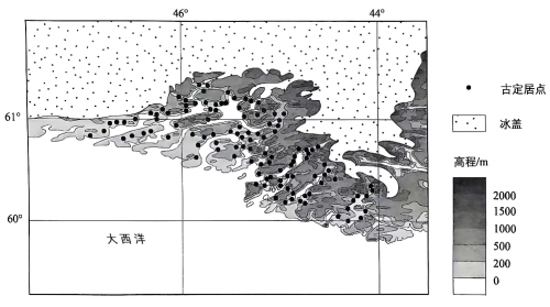格陵兰岛绝大部分区域被冰盖覆盖,沿海区域少量土地出露,生长着苔原植被。冰盖变化可以影响该岛地壳升降,进而引起海平面的相对变化。考古资料显示,10世纪末,以航海为生的维京人开始定居在该岛南端;定居中后期,该区域气候明显变冷,冰盖变化显著,环境持续恶化。15世纪中叶,在多种因素的影响下,维京人最终放弃了该定居区。下图示意维京人古定居点分布及区域地形。