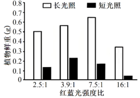 为研究光照对培养箱中拟南芥生长的影响,科研人员在总光强相同情况下设置了不同的红蓝光强度比,并改变光照时间,进行相关实验,部分结果如图。下列叙述正确的是( )