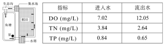 为探究种养关系,科研人员构建了“稻田-鱼塘循环水养殖系统”,如图所示,鱼塘养殖水被泵入水塔后,流经稻田、集水池和生态沟,再回流到鱼塘。稻田进入水和流出水中可溶性氧气浓度(DO)、总氮浓度(TN)和总磷浓度(TP)的检测结果如下表。