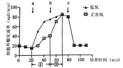 细胞呼吸产生的乳酸等物质的释放会引起胞外环境的酸化。为探究氧浓度对细胞呼吸的影响,科研人员将两组肿瘤细胞在不同氧浓度下短暂培养,在箭头所示的时间点更换新的无机盐缓冲液(不含葡萄糖),并分别添加相应的成分,其中a为足量的葡萄糖,b和c为有氧呼吸某一阶段的抑制剂,检测细胞外的酸化速率,结果如图。下列叙述错误的是( )