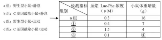 (3)研究发现C基因的突变与体重异常相关。据此,推测如下:运动时机体产生的乳酸在酶C的作用下转化为Lac-Phe,Lac-Phe可抑制肥胖的发生。为证实该推测,采用高脂饲料喂养不同条件处理的小鼠,一段时间后检测相应的指标,实验分组及部分结果如下表。