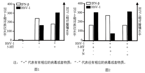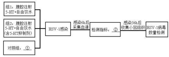 (2)体外实验研究5-HT对被HSV-1侵染的小鼠巨噬细胞的影响,实验分组和结果如图1,说明5-HT能______(填“促进”或“抑制”)巨噬细胞分泌干扰素β(IFN-β),并______(填“增强”或“减弱”)HSV-1的增殖。