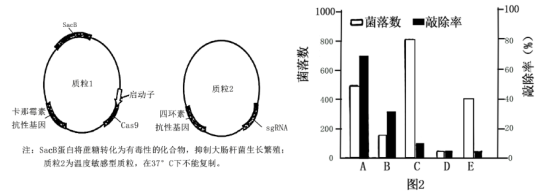 (2)Cas9基因的表达量会影响敲除效率,但其过量表达会对大肠杆菌有毒。为评估毒性和敲除效率,用5种启动子(A、B、C、D和E)启动Cas9的转录,相应检测结果如图2所示。结果表明,启动子______对细胞毒性最小;综合考量毒性和敲除效率,应选用启动子______用于该系统。