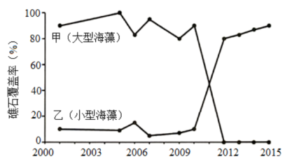 全球气候变暖是一个重要的生态问题。某地近海主要生活着两种底栖植物海藻甲和乙。2001—2015年间,它们在海底礁石上的覆盖率变化趋势如图所示,2010年后该海域海水平均温度有一定上升。