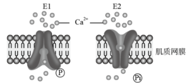 肌细胞质基质中 浓度升高将引起肌收缩。静息状态下,肌细胞质基质 浓度极低,此时胞内 主要存储于肌质网中(一种特殊的内质网)。肌质网膜上存在一种 载体,能催化水解ATP实现 逆浓度跨膜运输。该载体转运过程中的两个状态(E1和E2)如图所示。