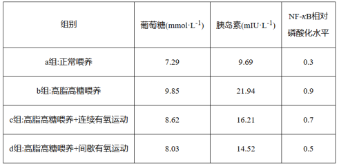 饮食和运动会影响机体血糖平衡,胰岛素是调节血糖的重要激素。 蛋白磷酸化水平异常会影响葡萄糖转运蛋白4(GLUT4)的表达水平,导致小鼠的胰岛素敏感性降低。为研究有氧运动方式对高脂高糖饮食小鼠血糖的影响,科研人员对小鼠进行分组实验,9 周后测定血液和肝脏中相关指标,结果如下表所示。