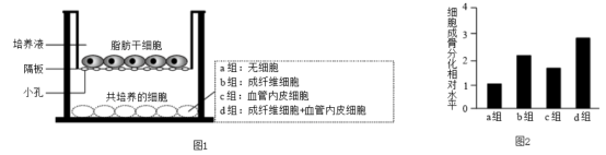 干细胞治疗为骨缺损的临床治疗提供了新思路。为探究不同细胞共培养对脂肪干细胞分化为成骨细胞的影响,科研人员利用图1装置对细胞进行共培养,装置的上下层通过小孔连通,一段时间后检测脂肪干细胞成骨分化相对水平,结果如图2所示。