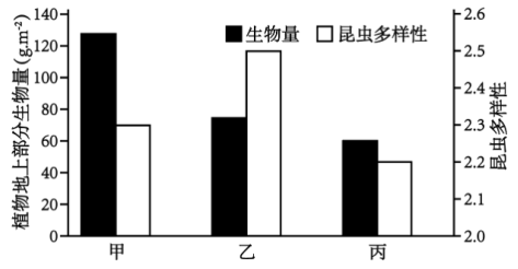 草地是陆地生态系统的重要组成部分。为研究不同放牧强度对草地植物生物量和昆虫多样性的影响,科研人员在某高山天然草甸选取了相同条件的甲、乙、丙三块地,分别进行不放牧、轻度放牧和重度放牧三种方式的处理,测定相关指标,部分结果如图所示。