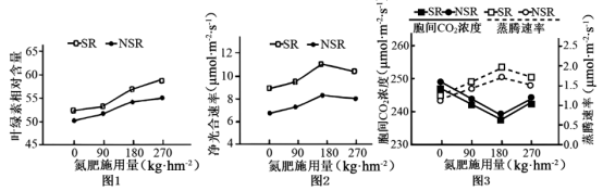 (1)玉米绿叶中的叶绿素主要吸收______光。据图1、2可推测,等量配施氮肥条件下,与NSR相比,SR的玉米叶肉细胞中光反应会产生更多的______。据图2可知,与NSR相比,SR显著提高了净光合速率,其净光含速率随着施氮量的增加呈______。