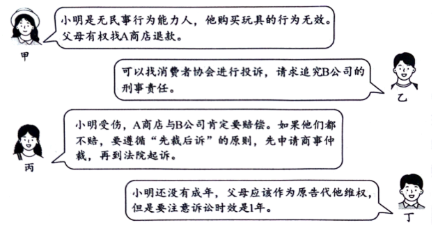 7周岁的小明在A商店购买了一款儿童玩具。小明在玩玩具时,玩具因质量问题爆炸导致小明轻伤。经查,该玩具由B公司生产,A商店销售。对于本案,小明的父母找了几位朋友咨询维权问题。他们说: