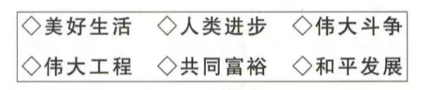 (2)从下列方框中选择两个最符合材料一主旨的关键词,并运用《中国特色社会主义》知识,写出你的感想。