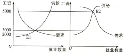 下图是某地区低技能、高技能劳动力市场供给与需求曲线图。在某时间段两个市场分别在E1和E2点运行,若该地区将最低工资从2000元/月提至3000元/月,将导致( )
