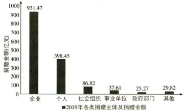 慈善捐赠是慈善组织开展各项社会服务的基础。资料显示,2019年我国内地各类慈善组织共接收款物捐赠1509.44亿元,创历史新高。2019年各类捐赠主体及捐赠额情况如下图所示。慈善捐赠( )
