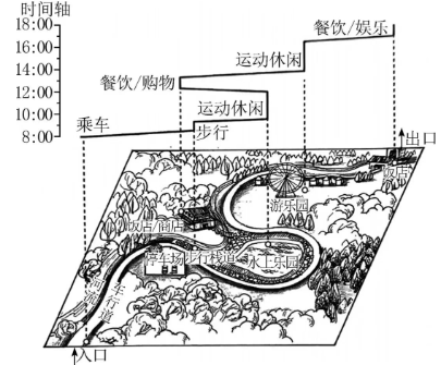 福建省某森林公园风景优美,成为运动休闲的网红打卡地。假设该公园每个游客的活动类型基本一致,下图示意某游客的活动轨迹。一天中的不同时段,单位面积旅游活动碳排放量的估算公式为:日人均碳排放总量×游客密度×不同时段游客数量占比。日人均碳排放总量为游客一天中各项活动人均碳排放量之和。