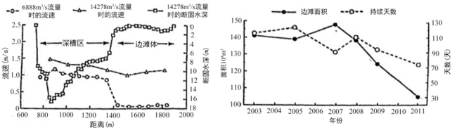 边滩是由于河流沉积作用形成的与河岸相连的泥沙质堆积体。三峡水库运行后,长江中游边滩整体呈萎缩态势。研究表明,长江中游某段河道河床泥沙起动流速在 之间。左图示意该段河道某断面在不同流量时的流速与水深情况。右图示意该段河道流量超过 的持续天数与边滩面积关系。据此完成下面小题。