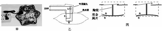 (6分)图甲是一种常见的电热水袋,图乙是它的结构示意图。为了使用安全,电热水袋在用电加热到一定温度时温控开关S会自动切断电路,与此同时专用插头上的红色指示灯L会熄灭起提示作用。