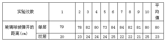 ②将橡胶球拉到相同高度,放手后让其敲击玻璃板,玻璃球被弹开,记下玻璃球被弹出的距离。共做10次。