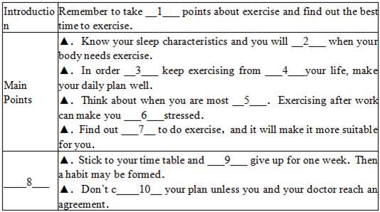 Lastly, find out the place you plan to do exercise.Your house provides exercise at any time if you own fitness equipment(设备),but if there is a gym(健身房)down the street or along the way home from work, it will make it more suitable for you to exercise.