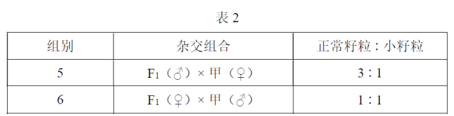 (2)为研究部分F 1植株致死的原因,科研人员随机选择10株乙,在自交留种的同时,单株作为父本分别与甲杂交,统计每个杂交组合所产生的F 1表现型,只出现两种情况,如下表所示。